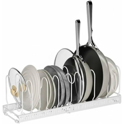 Adjustable Pot & Lid Storage Rack with 10 Dividers, Expandable Base, U-Shaped Slot for Lid Handles, Countertop